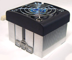 Spire 5R266B1H3 Copper Core Heatsink Review Built with the AMD Athlon 1.4GHz and AMD AthlonXP 2200+ in mind, the Spire 5R266B1H3 EagleStream is a standard 6063 T5 aluminum extrusion with a special 30mm diameter copper core insert. The copper insert makes direct contact with the processors core to help spread out the heat to the remaining aluminum body. Additionally, we can see that this heatsink uses a nice three-prong clip. Socket A heatsinks can often exert enough force over time to snap of the little plastic tabs on the socket. With the clip using all three the chances of this happening are pretty remote. Spire / Speeze and Fanner are all names that have been used independently for the products from this company, Fanner Tech Co. To keep things simple, we have listed this heatsink under the name of "Spire." The packaging says Speeze, but the two are the same company anyway.