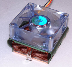 The Fortis Tech A93 is an interesting little heatsink that comes with a fan RPM alarm and a small tube of "silver" based thermal compound. The little alarm gives out a horrible beeping sound when the fan is stopped, or comes close to stopping under power. The actual unit is made by computerdiy.com.tw from what we can tell, and consists of a small circuit board behind the blue protective casing. When the fan first powers up, there is a short squeal as the sensor kicks in. The A93 is shown here with a 70mm fan attached, but if you did want to drop down to a 60mm fan it's worth noting that the green anodized aluminum fan shroud is tooled for either fan (70mm and 60mm screw holes are pre-made).