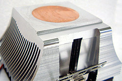 Evercool ND19715CA Copper-Core Heatsink Review We've reviewed heatsinks with similar appearances as the unit we are testing today but so far each version has managed to remain a little bit different than the others. Some versions came equipped with copper additions, others without. In this case, the Evercool ND19715CA sports a 'chewy' copper center. A chocolate bar the Evercool ND19715CA isn't, but with a 35mm diameter copper disc embedded into the aluminum base we should hopefully see some interesting thermal results. While the ND19715CA isn't a true silent heatsink since it measures in at over 40dB, it does manage to operate will low-to-moderate noise levels making it potentially ideal for home computers. One of the other nice aspects of this heatsink is that the outward slope of the fins makes it less likely that closely placed capacitors around the processor socket will cause any interference. A little thing perhaps, but having to bend capacitors to install a heatsink is never a good idea no matter how you look at it.