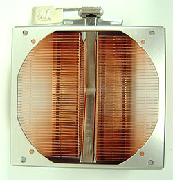 The stacked copper fins overhang the copper base they are soldered to along one side. Each 38mm wide fin connects with 20mm of surface at the base. The aluminum shroud which supports the fan has mounting holes for 80mm and 70mm fans so users have the option of installing different sized fans. The support also creates a 5mm plenum above the copper fins to promote more even airflow.