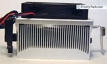 The 35 extruded aluminum fins measure roughly 29 x 27mm in size. Each fin is 0.8mm thick and spaced 1.4mm apart. This is a fairly fine fin-pitch for an extruded heatsink. There is a 5mm plenum below the fan itself created by the aluminum fan shroud. The center 10mm of the heatsink are occupied by the tooless clip mechanism, rather than cooling fins with is unfortunate with this design.