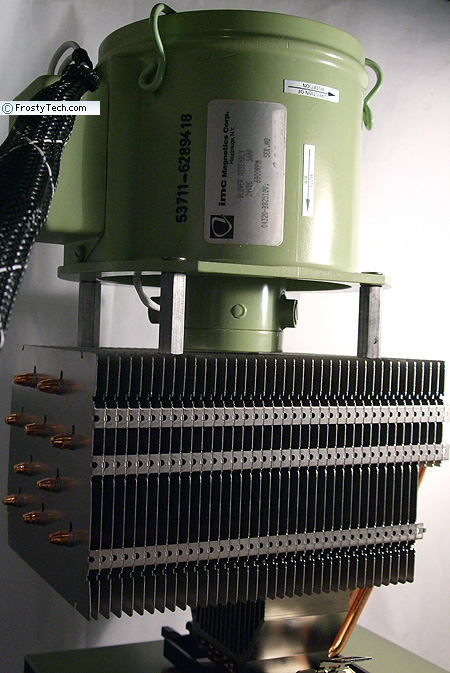 To find out, Frostytech mounted a mil-spec IMC Magnetics vane-axial fan on top of the Orochi heatsink. This IMC Magnetics fan has a working diameter of 120mm, and draws 24V, 5A to drive a cast-aluminum 12-bladed impeller at 6000RPM. Airflow is estimated at between 100-150CFM, but we haven't been able to track down exact specs. The model number is 04320-BD2510V and NSN is 4140-01-432-0292 (if you can track down a spec sheet let us know). A dedicated 24V DC Acopian power supply is used to power the IMC fan, which at full speed generates about 90 dBA noise. Here's the business end of the 04320-BD2510V blower.