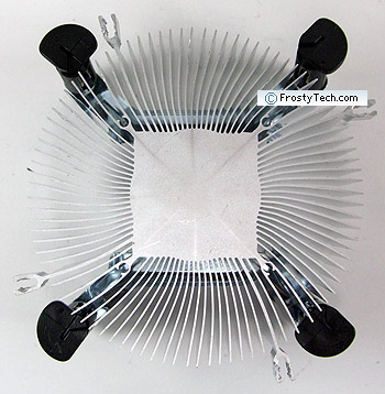 The extruded aluminum fins are about 36mm high, while the fan measures 25mm thick. Each aluminum fin is ~0.5mm thick, and spaced about 2.5mm apart at the edge. Standard Intel plastic push-to-click tabs are used to install the Igloo 5063 Light heatsink.