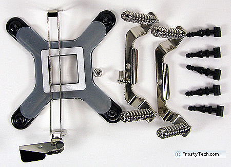 The Xigmatek Dark Knight S1283 heatsink ships with brackets for LGA775 and AMD K8 processors (754/939/940/AM2 respectively). The Intel socket 775 clips use spring tensioned machine screws that mate with a supplied metal back plate. AMD Athlon64 processors on 754/939/940/AM2/AM2+ work with a modified spring clip that attaches to the lugs on the AMD heatsink retention frame. A cam lever at one end of the clip applies pressure to the heatsink base directly. The AMD clip is tool free, but the metal is thin and tends to bend towards one side or another after clamping pressure is applied.