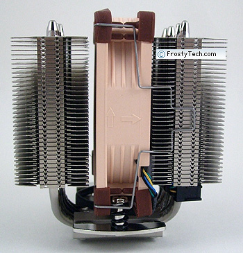 The Noctua NH-D9L heatsink uses a nickel-plated copper base plate which is machined very smooth, surface roughness is at or better than ~8 microinches. The base is very slightly concave in the axis parallel to the heatpipes, very slightly convex in the opposite direction. Sound level measurements are coming up next on Frostytech...